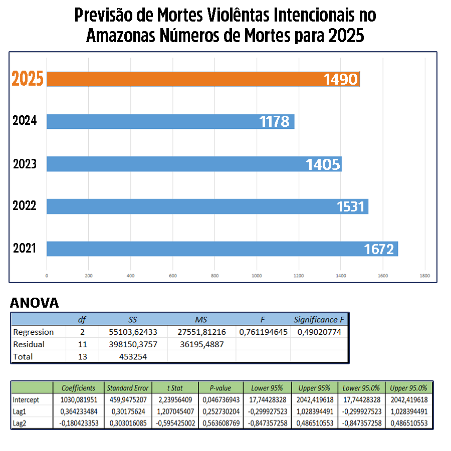 Estatística: Utilizando inferência estatística com intervalo de confiança de 95% e p-valor de 0,436, a partir de uma análise de autoregressão dos dados oficiais de criminalidade do Estado do Amazonas, entre 2011 a 2024, estima-se que, em 2025, ocorrerão 312 novos casos de mortes violentas intencionais.